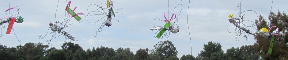 No Easter Eggs here! Rather cool this morning, so I was walking briskly by the Nepean River when I spied these dragonflies made by children during a workshop at the nearby Lewers Galleryyesterday. So delightful!