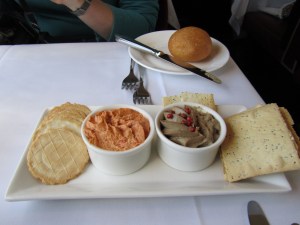 Where to start? A little water first & then some nice sparkling wine (aka champagne). Wasting no time, we tried the appetiser. It was Chicken liver & cognac pate, and Roasted red capsicum dip.