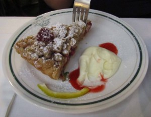 The Zucchini flowers are delectable & so light, as I was promised. The salad finishes it off beautifully & as we’re not bustled there’s plenty of time for dessert before we join the throngs returning interstate.