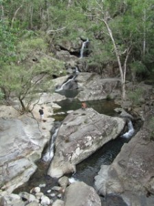 Off again, this time to Hidden Valley Cabins. Nice to have a 9am pick up from Townsville and explore the city sights including Castle Hill. From here (if it’s clear) there are magnificent 360 views to Magnetic island and all about from the nearby lookouts. There are several walking or running tracks which are steep but still very popular. Heading North West towards the Paluma National Park we came to Little Crystal Creek near the bottom of the range. The road and stone bridge were built in the 1930’s and there’s It’s a delightful place to stop for a picnic, byo thermos & scones, and climb over the rocks up to the waterfall and rock pools.
