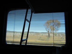 My goodness, it’s dark on the top bunk of a sleeper as you hurtle through the night. 9.30pm. Boarding the Sunlander at Proserpine means the seat is gone and there’s bunk beds instead. Bad luck if your top bunk with a crook leg! Luckily, there’s my trusty little torch and some MacDonalds cookies to munch on during the night. Rather strange to be lying down sideways as you move forward, so for a while I just sat and listened to my audiobook on the trusty ipod. 5am Rockhampton coming up. Time for other passengers to leave. Toilet at the end of the carriage so it’s a good opportunity. Feeling like Long John Silver with a peg leg, I venture out and manage to return safely. No idea how to lock the door of the sleeper. Later, the magic key was discovered on the seat when the beds went back up. Pretty snazzy how the bunks change into seats, quite comfy and much more spacious. First Class is fine, but I wonder what it’s like in Queenslander(=Scone) Class. Breakfast beckons.