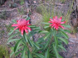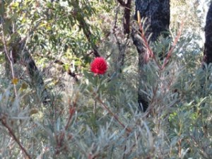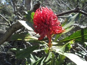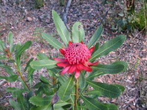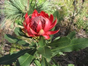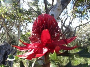 Missed the Mt Tomah Botanical Gardens Wild About Waratahs festival which ran from the 24th September to 9 October, 2011. Instead of scones, we were hunting around the bush near Hyams Beach for Waratahs. In the wild they are quite delightful when you happen upon them singly, in pairs or groups. We only found a few but they were worth the walk, although the occasional strong winds meant keeping our wits about us.
