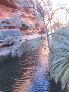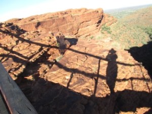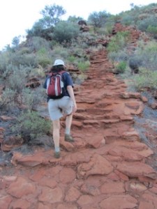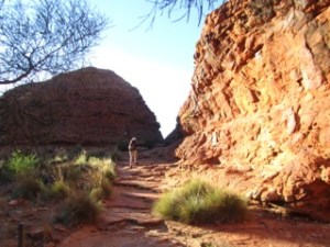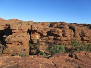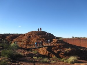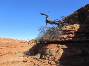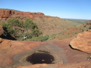 includes Kings Canyon. The Rim walk is 6km and takes about 3.5 hours. It is strenuous and has plenty of steps and bridges but it’s well worth the effort. There is no actual track but a series of arrows to follow from one point to another. With all the other hikers around, they are not too hard to find but start off as early as you can and check the day’s temperature range. The scenery is spectacular and rather enticing as you explore the cliffs, rock formations, nooks, crannies and possibly spy some fossils. The waterhole is an especially welcome haven before the climb back out to the carpark’s welcome seat, shade, and toilet!
