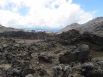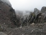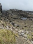 So we practice patience and wonder if we’re having delusions as some rocky outcrops and the valley below gradually appear. It was all pretty dismal and barren, as you’d expect on a lava flow but captivating at the same time with the awesome power of nature right before us. Fancy living here. The altitude is 16oo metres. In winter the transformation in snow and with skiers would be striking. It’s very, very quiet.